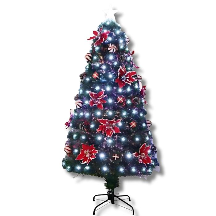 Φέρτε τη μαγεία των Χριστουγέννων στο σπίτι σας με αυτό το εντυπωσιακό τεχνητό Χριστουγεννιάτικο δέντρο ύψους 180 cm, στολισμένο με φωτεινά LED ψυχρού λευκού χρώματος και κόκκινα διακοσμητικά λουλούδια .