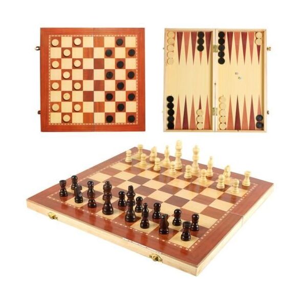 Ξύλινο, πανέμορφο σετ ταξιδίου 3 παιχνιδιών (τάβλι – σκάκι – ντάμα).