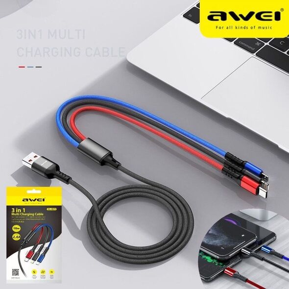 3 Σε 1 USB Καλώδιο Φόρτισης Type-c, Lightning, microUSB - AWEI Multi Charging Cable 2.4A