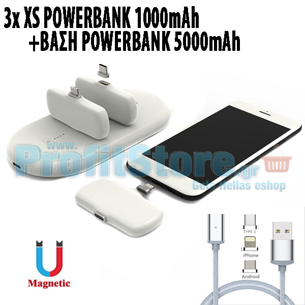 3 x Φορητά XS Μαγνητικά Powerbank 1000mAh με Βάση Μπαταρία Φορτιστή USB 5000mAh 3+1, Μαγνητικό Καλώδιο & Ακροφύσια Micro USB, Type C & Lightning