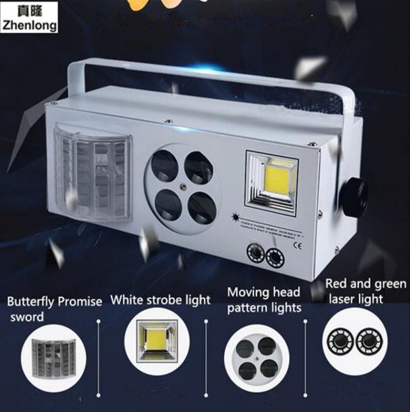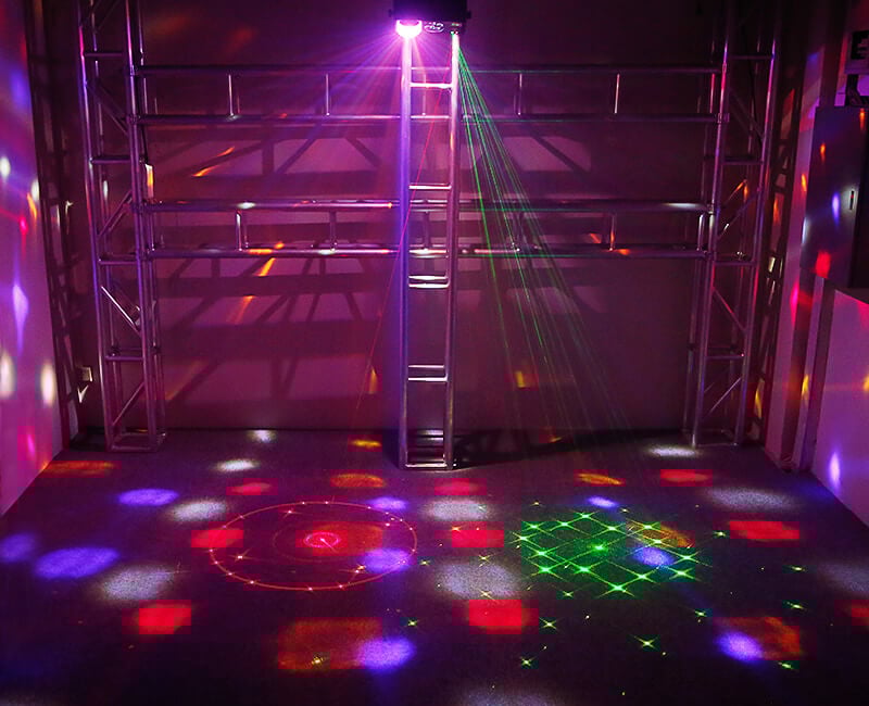 Διαθέτει 4 διαφορετικές Πηγές φωτισμού, Laser, Spot Led, Πολύχρωμα Led και Strobe.