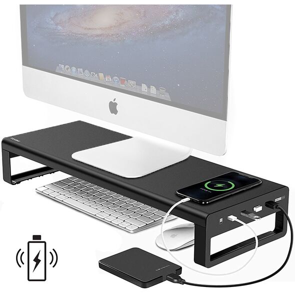 4x USB HUB & Βάση για Οθόνη Υπολογιστή Η/Υ Γραφείου & Ασύρματος Φορτιστής Fast Charge Vaydeer - Μαύρο Αλουμινίου