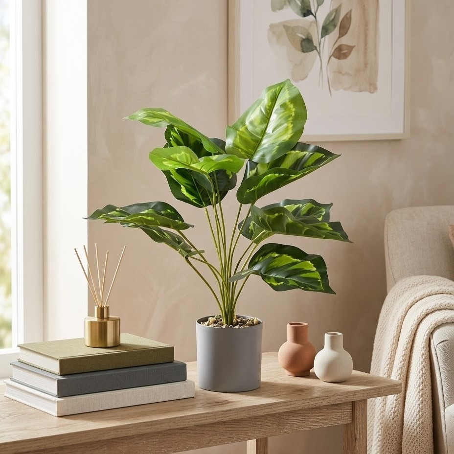 ✔️ Πλούσια πράσινα φύλλα: Η πλούσια φυλλωσιά και οι φυσικές αποχρώσεις του πράσινου χαρίζουν ζωντάνια και φρεσκάδα σε κάθε δωμάτιο, ενώ η σταθερή βάση εξασφαλίζει εύκολη τοποθέτηση σε τραπέζια, ράφια ή έπιπλα.