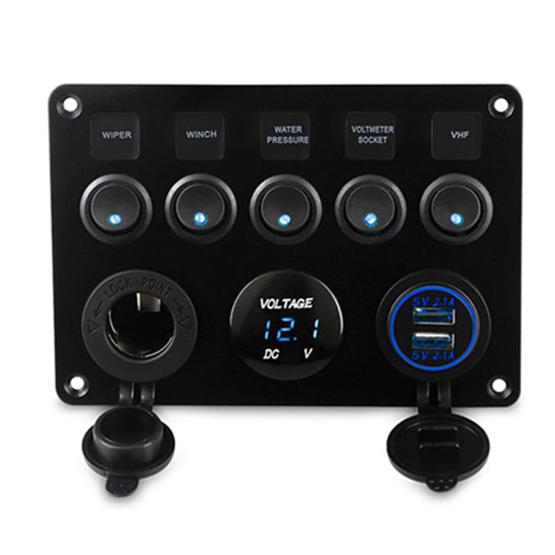 Αδιάβροχο Πάνελ Ελέγχου 12V LED Φωτιζόμενος με 2x USB Φόρτισης, Ψηφιακό Βολτόμετρο, Αναπτήρα & 5 Διακόπτες για Σκάφη - Panel Marine