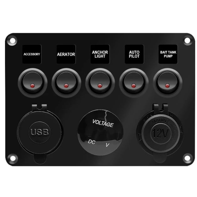 Αδιάβροχο Ψηφιακό Πάνελ Ελέγχου 12V με 5 Διακόπτες, Βολτόμετρο & USB - Για Σκάφη, Αυτοκίνητα - Panel Marine