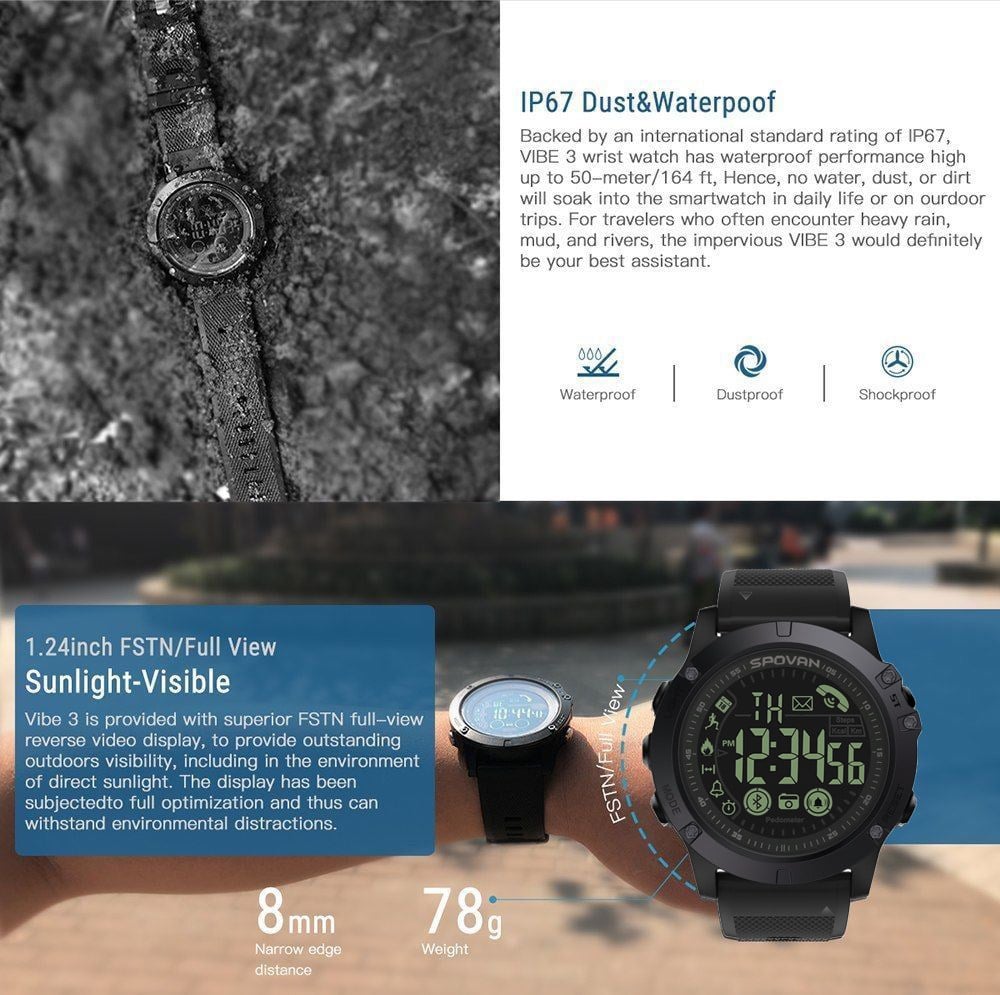 Μοναδικό Sport Military Bluetooth Smartwatch ρολόι για κάθε αθλητή. Είναι αδιάβροχο 5ΑΤΜ, με βηματομετρητή & υπολογιστή θερμίδων. Διαθέτει Transflective οθόνη που παραμένει διαρκώς αναμμένη, μπαταρία απίστευτης διάρκειας 1 έτους, νυχτερινό φωτισμό (back light), ειδοποιήσεις και μηνύματα, μέτρηση της απόσταση που διανύθηκε απομακρυσμένη λειτουργία λήψης φωτογραφιών Remote Camera και πολλές ακόμα έξυπνες λειτουργίες που θα σας συναρπάσουν!