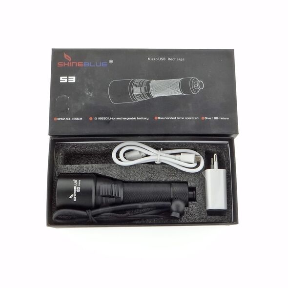 Ο SHINEBLUE S3 είναι ένας υποβρύχιος, LED φακός που λειτουργεί με 1 επαναφορτιζόμενη μπαταρία Li-ion 18650.