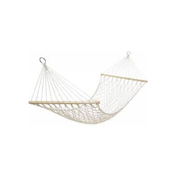 Μια αιώρα μονή αντοχής έως και 120kg, δροσερότερη των άλλων, λόγω της ροής του αέρα μέσα από το δίκτυ της, βαμβακερή και με 2 ξύλινους πήχεις που της εξασφαλίζουν μεγαλύτερη σταθερότητα, είναι ιδιαίτερα ανθεκτική, άνετη και εύκολη στην μεταφορά και την τοποθέτησή της στον κήπο σας ή οπουδήποτε αλλού