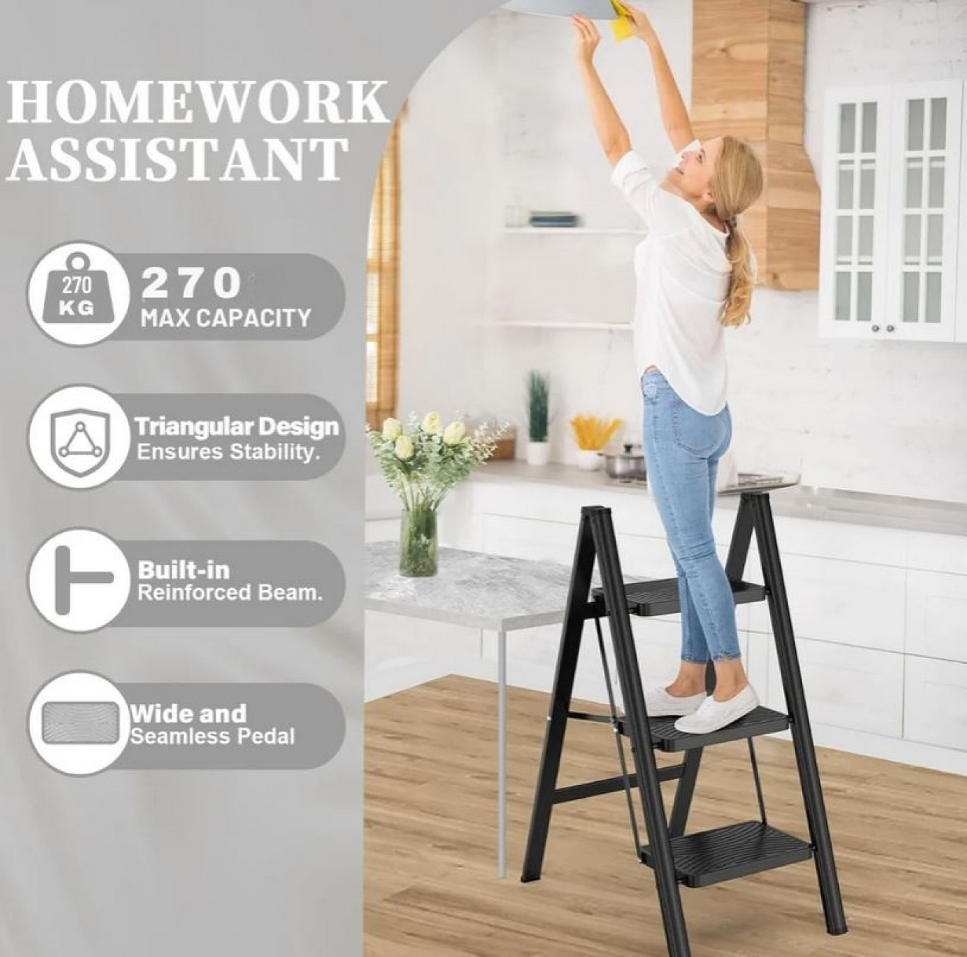 ✔️ Με μέγιστη αντοχή έως 270 κιλά, το σκαλοσκαμπό είναι κατάλληλο για χρήση στην κουζίνα, το σαλόνι, το μπαλκόνι ή ακόμη και στον επαγγελματικό χώρο, προσφέροντας μια πρακτική και αξιόπιστη λύση για πρόσβαση σε μεγαλύτερα ύψη ή για χρήση ως βοηθητικό έπιπλο.