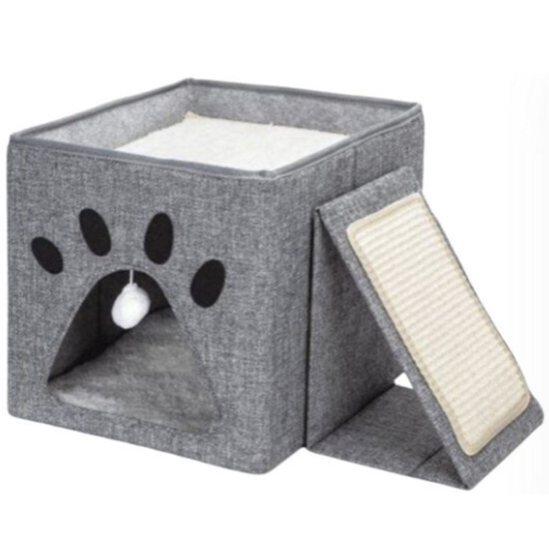Αναδιπλούμενο σπιτάκι γάτας Nobleza (48 x 35 x 29cm) με κρεμαστό παιχνίδι, ονυχοδρόμιο και άνετη επιφάνεια ανάπαυσης. Ιδανικό για ξεκούραση και παιχνίδι, με κομψό γκρι σχεδιασμό και εύκολη αποθήκευση.