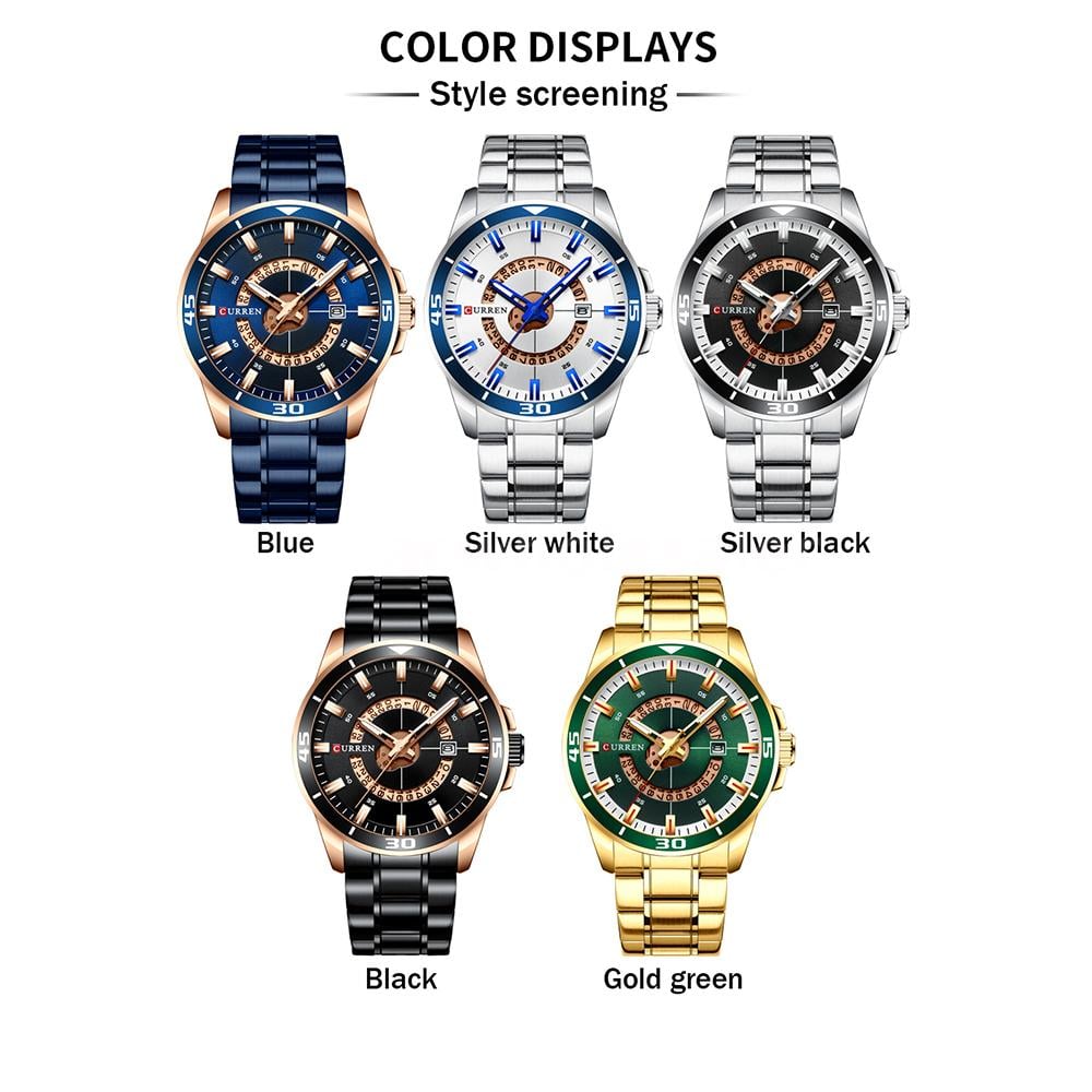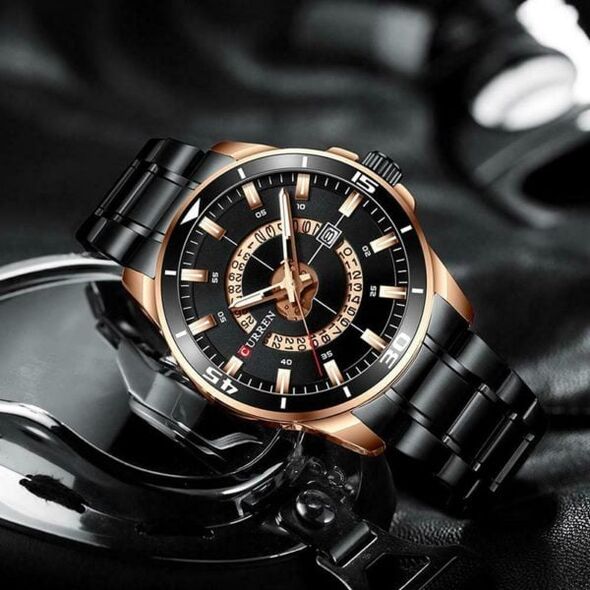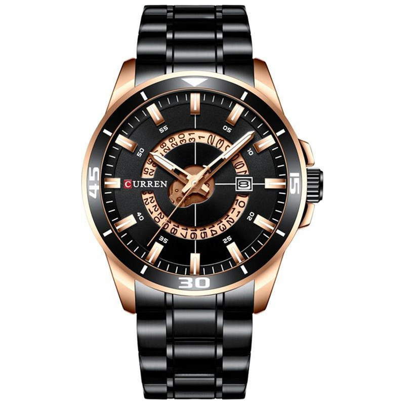 Ανδρικό αδιάβροχο ρολόι Curren με μαύρο μπρασελέ από ανοξείδωτο ατσάλι, μεταλλική ροζ-χρυσή κάσα και μαύρο καντράν με ροζ-χρυσές λεπτομέρειες και ένδειξη ημερομηνίας.