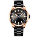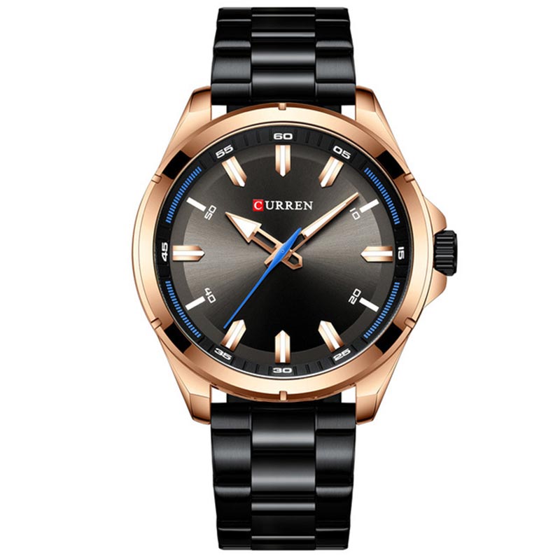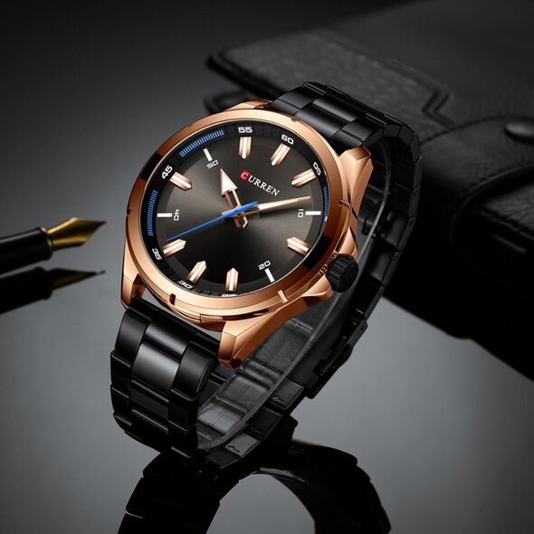 Ανδρικό αδιάβροχο ρολόι Curren με μαύρο μπρασελέ από ανοξείδωτο ατσάλι, μεταλλική ροζ-χρυσή κάσα και μαύρο καντράν με ροζ-χρυσές και μπλε λεπτομέρειες.
