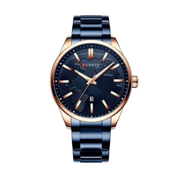 Ανδρικό αδιάβροχο ρολόι Curren με μπλε μπρασελέ από ανοξείδωτο ατσάλι, μεταλλική ροζ-χρυσή κάσα και μπλε καντράν διακοσμημένο με ανάγλυφο σχέδιο, ροζ-χρυσές λεπτομέρειες και ένδειξη ημερομηνίας.