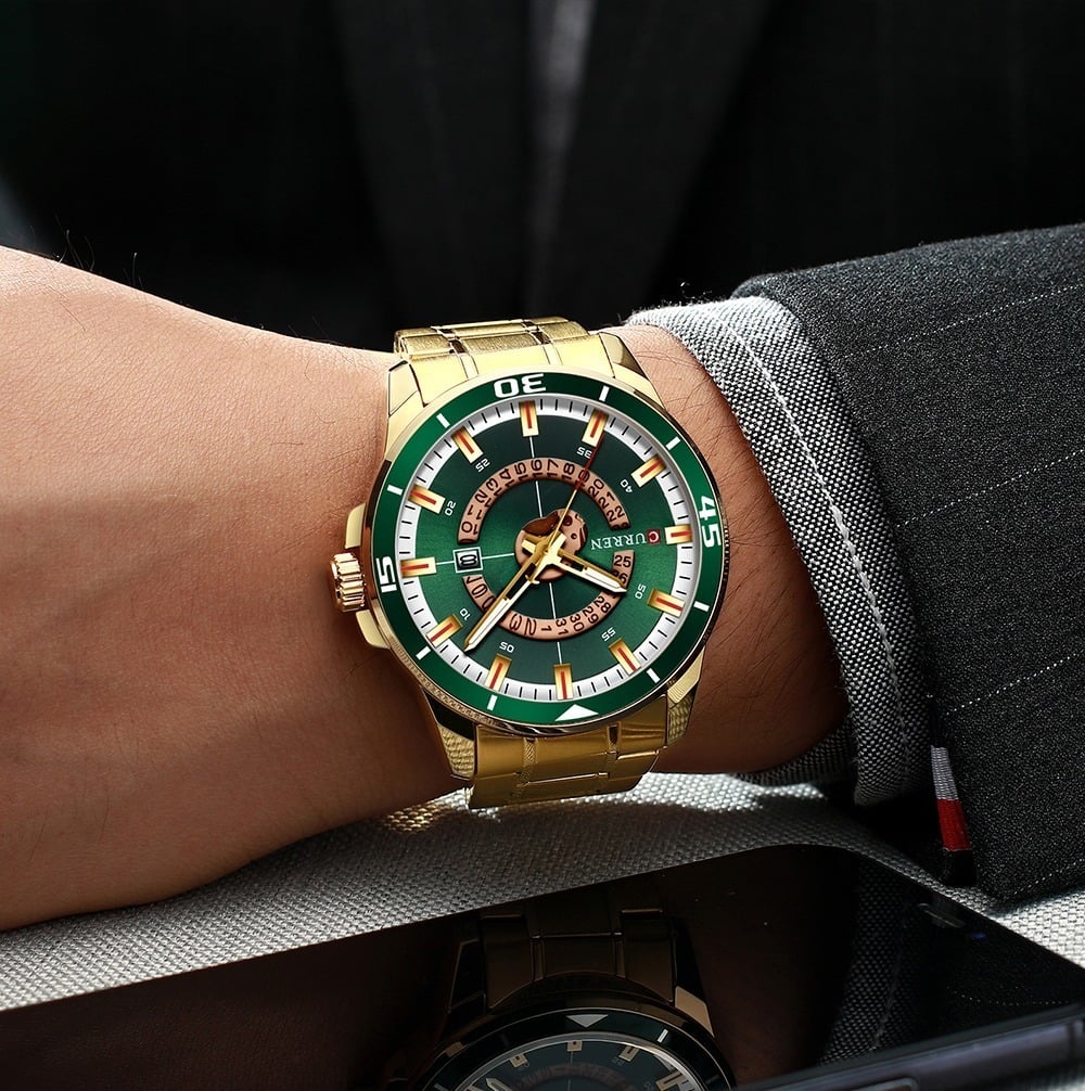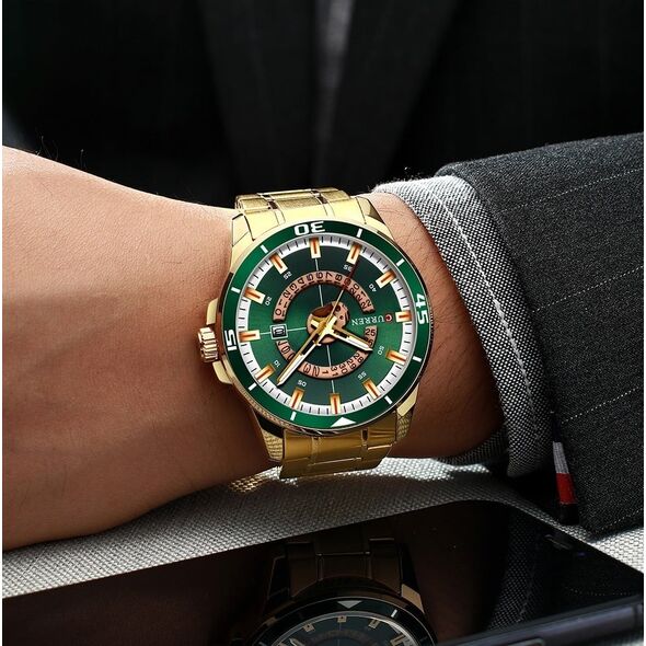 Ανδρικό αδιάβροχο ρολόι Curren με χρυσό μπρασελέ από ανοξείδωτο ατσάλι, μεταλλική χρυσή κάσα και πράσινο καντράν με χρυσές λεπτομέρειες και ένδειξη ημερομηνίας.