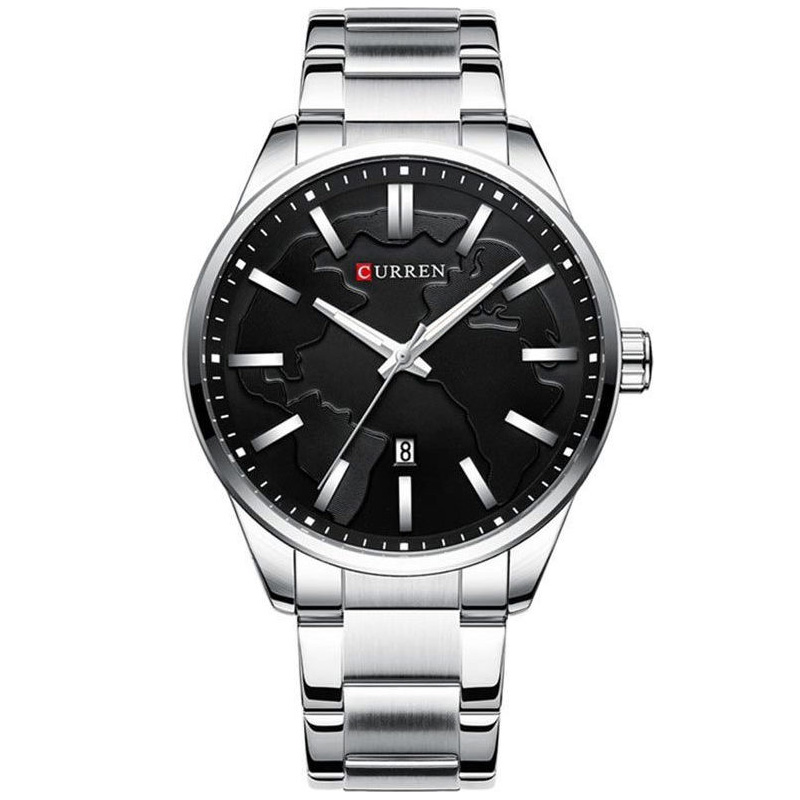 Ανδρικό αδιάβροχο ρολόι Curren με ασημί μπρασελέ από ανοξείδωτο ατσάλι, μεταλλική ασημί κάσα και μαύρο καντράν διακοσμημένο με ανάγλυφο σχέδιο, ασημί λεπτομέρειες και ένδειξη ημερομηνίας.