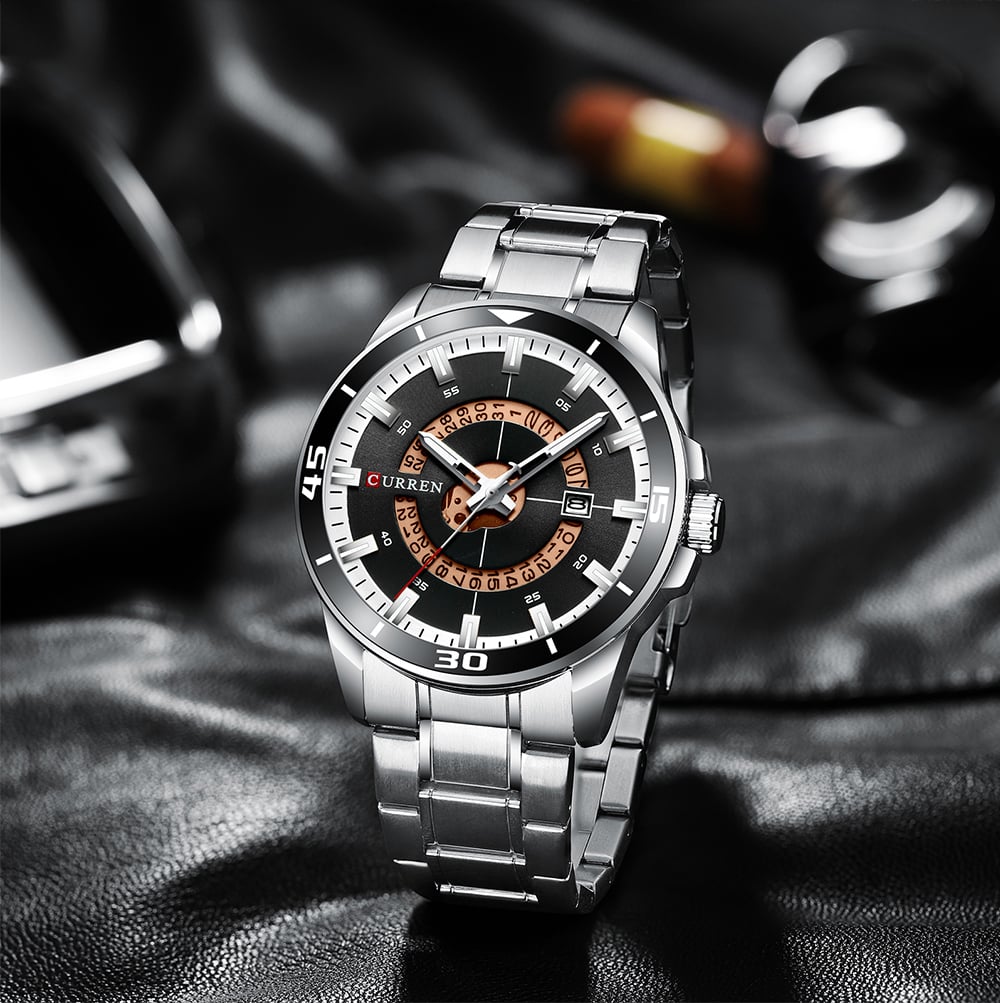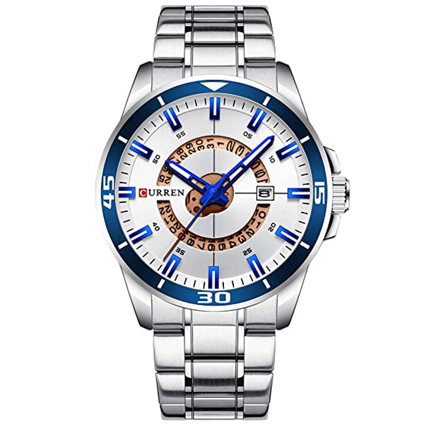 Ανδρικό αδιάβροχο ρολόι Curren με ασημί μπρασελέ από ανοξείδωτο ατσάλι, μεταλλική ασημί κάσα και μπλε καντράν με ασημί λεπτομέρειες και ένδειξη ημερομηνίας.