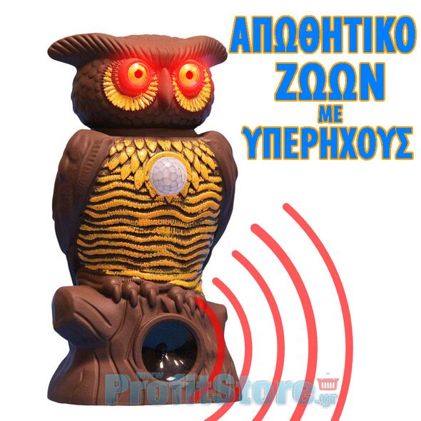 Εξαιρετικά καινοτόμο και πολύ ισχυρό απωθητικό ζώων υπέρηχων, σε μορφή κουκουβάγιας, με αισθητήρα κίνησης ( PIR Motion Sensor ) και LED laser φωτισμό στα μάτια. Απωθεί γάτες, σκύλους, αλεπούδες, ποντίκια, αρουραίους, σκίουρους, κουνέλια, λαγούς κλπ