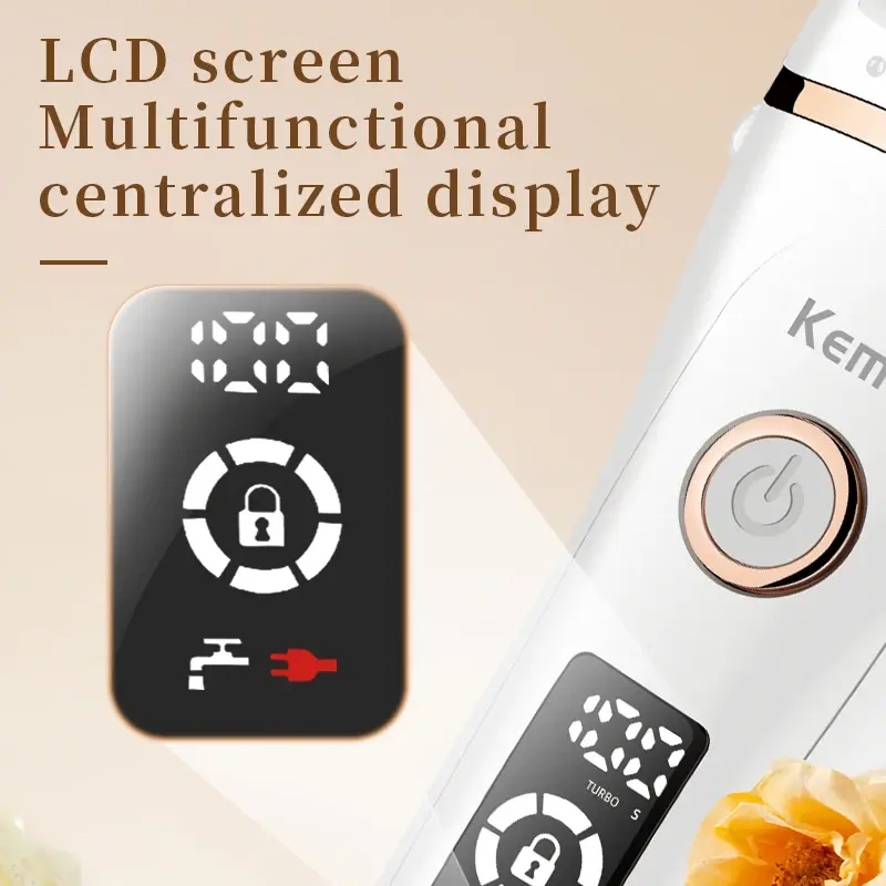 Η Kemei είναι μισ αποτριχωτική μηχανή 4 σε 1 για πρόσωπο και σώμα, με υποαλλεργική λεπίδα, οθόνη LCD, πλήρως πλενόμενη IPX5 και επαναφορτιζόμενη USB. Ιδανική για μπικίνι, φρύδια, ευαίσθητα σημεία και γρήγορη περιποίηση στο σπίτι ή στις διακοπές.