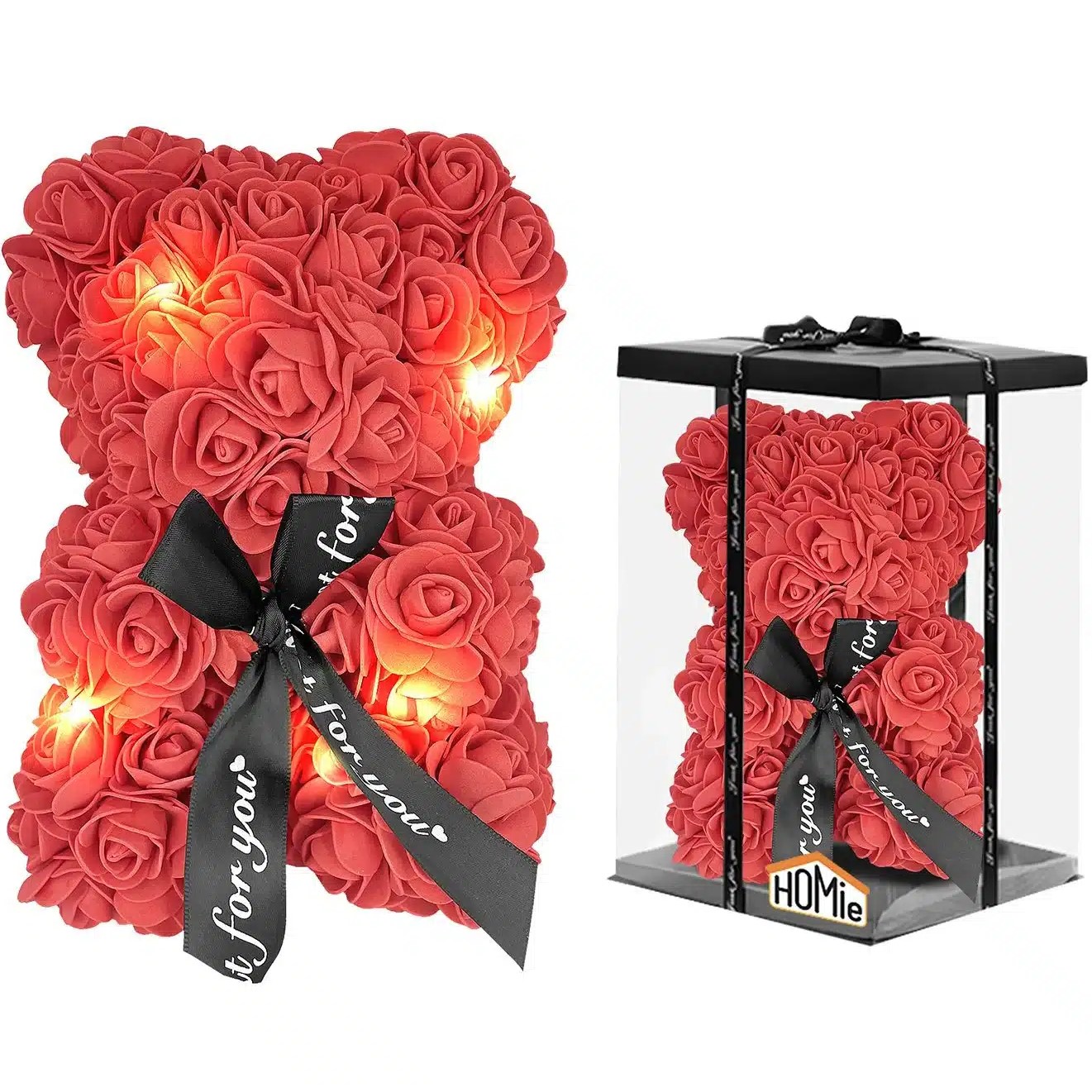 Αρκουδάκι από Κόκκινα Τεχνητά Τριαντάφυλλα με Φωτάκια σε Συσκευασία Δώρου 23 cm - Homie