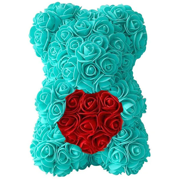 Αρκουδάκι από Τεχνητά Τριαντάφυλλα σε Συσκευασία Δώρου με Φιόγκο 25cm - Αρκούδι που κρατάει Καρδούλα Rose Bear - Δώρο Αγίου Βαλεντίνου Τιρκουάζ