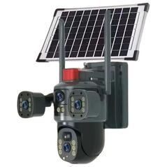 Ηλιακή ασύρματη κάμερα ασφαλείας 4G με τριπλή κάμερα, πανοραμική περιστροφή, ανάλυση Full QHD 2K, IP66 αδιαβροχοποίηση και αποθήκευση σε cloud ή microSD. Με ηλιακή φόρτιση και αμφίδρομη επικοινωνία για πλήρη έλεγχο από το κινητό.