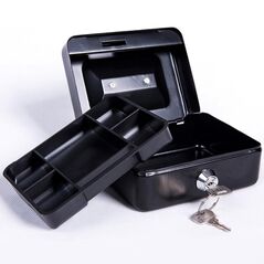 Μεταλλικό κουτί ταμείου με αποσπώμενη κερματοθήκη, κλειδαριά ασφαλείας και διπλό επίπεδο αποθήκευσης. Ιδανικό για χρήματα, κοσμήματα, τιμαλφή και έγγραφα σε σπίτι ή γραφείο.