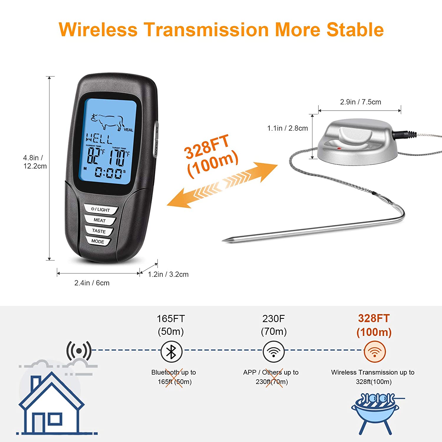 Σε σύγκριση με την παραδοσιακή μετάδοση Bluetooth, το θερμόμετρο ψησίματος είναι εξοπλισμένο με εξαρτήματα πομπού και δέκτη που έχουν μια μοναδική ζώνη, μπορούν να μεταδίδουν σταθερά σήματα σε μεγαλύτερη απόσταση (328 πόδια μέγιστη απόσταση). Σας δίνει ακριβή θερμοκρασία σε πραγματικό χρόνο. Χωρίς καθυστερημένα σήματα, χωρίς λανθασμένη θερμοκρασία και χωρίς υπερβολικό ψημένο κρέας.