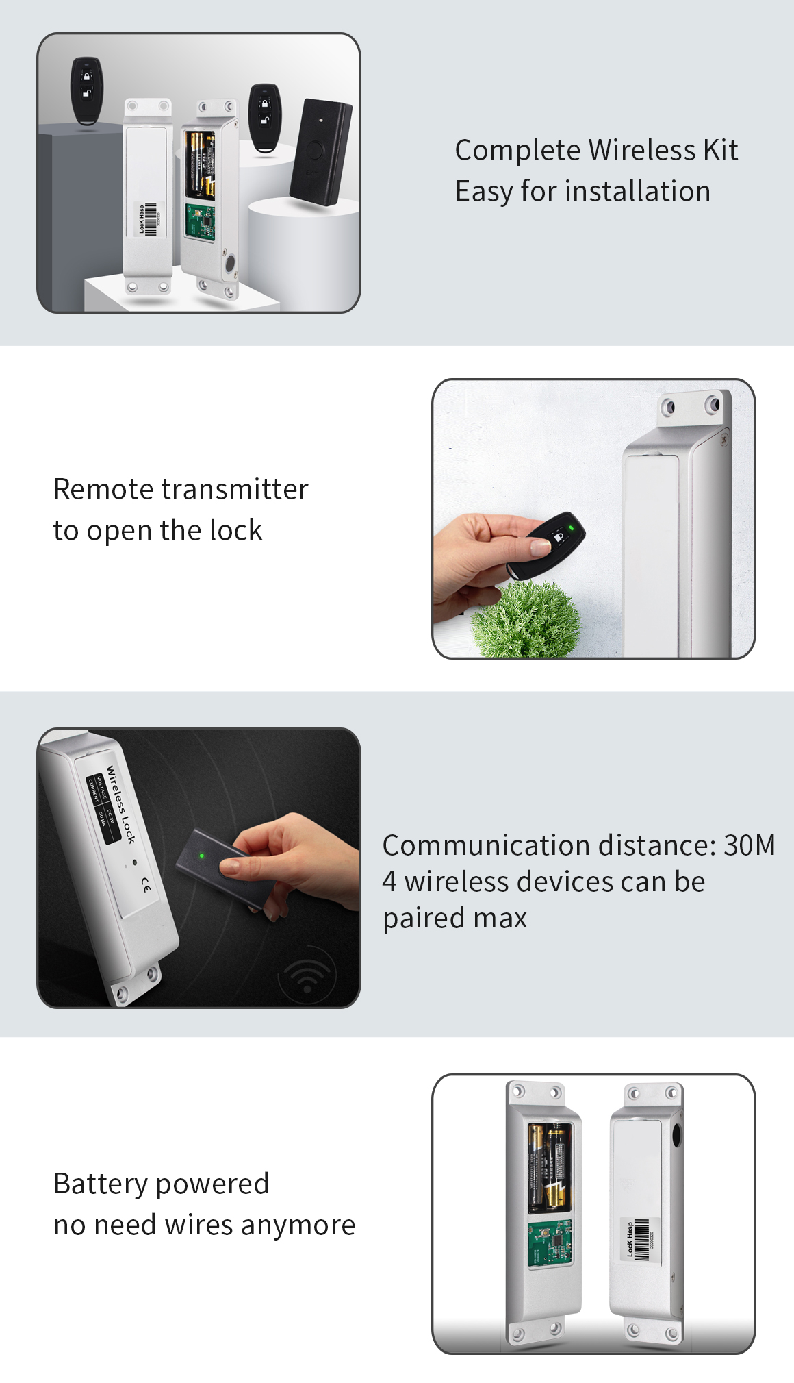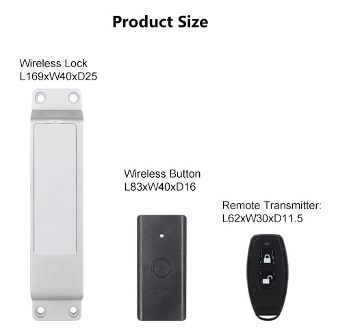 - Διαστάσεις: Wireless Lock: 170×39×25mm, Wireless Exit Button: 83×40×16mm, Remote Transmitter: 62×30×11.5mm