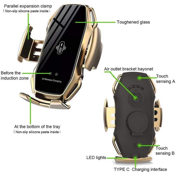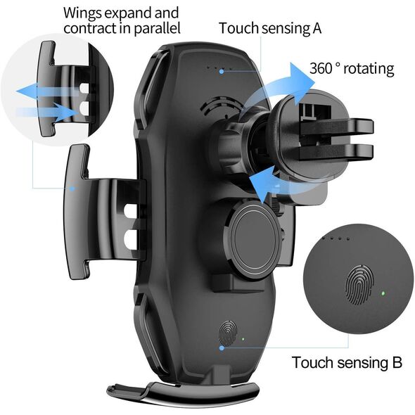 Αυτός ο φορτιστής, διαθέτει αισθητήρες υψηλής ακρίβειας, που αντιλαμβάνονται την στιγμή που τοποθετείτε το κινητό στην βάση, και κλείνουν αυτόματα τα "πιαστράκια" της, αγκαλιάζοντας το κινητό σφιχτά και σταθερά. Και όταν θελήσετε να το ξανά πάρετε στο χέρι σας, απλά πατήστε ένα από τα κουμπιά αφής στο πίσω μέρος, και η βάση θα απελευθερώσει το κινητό.
