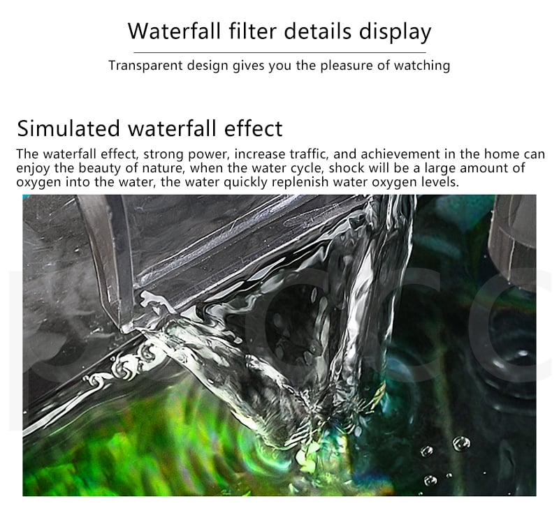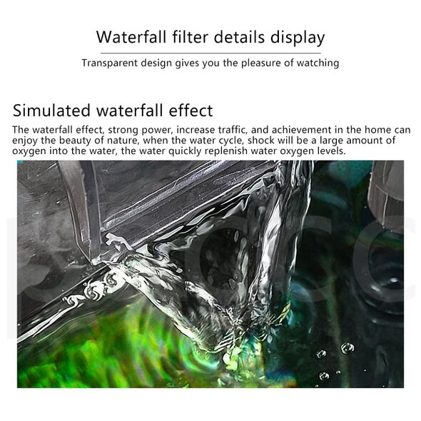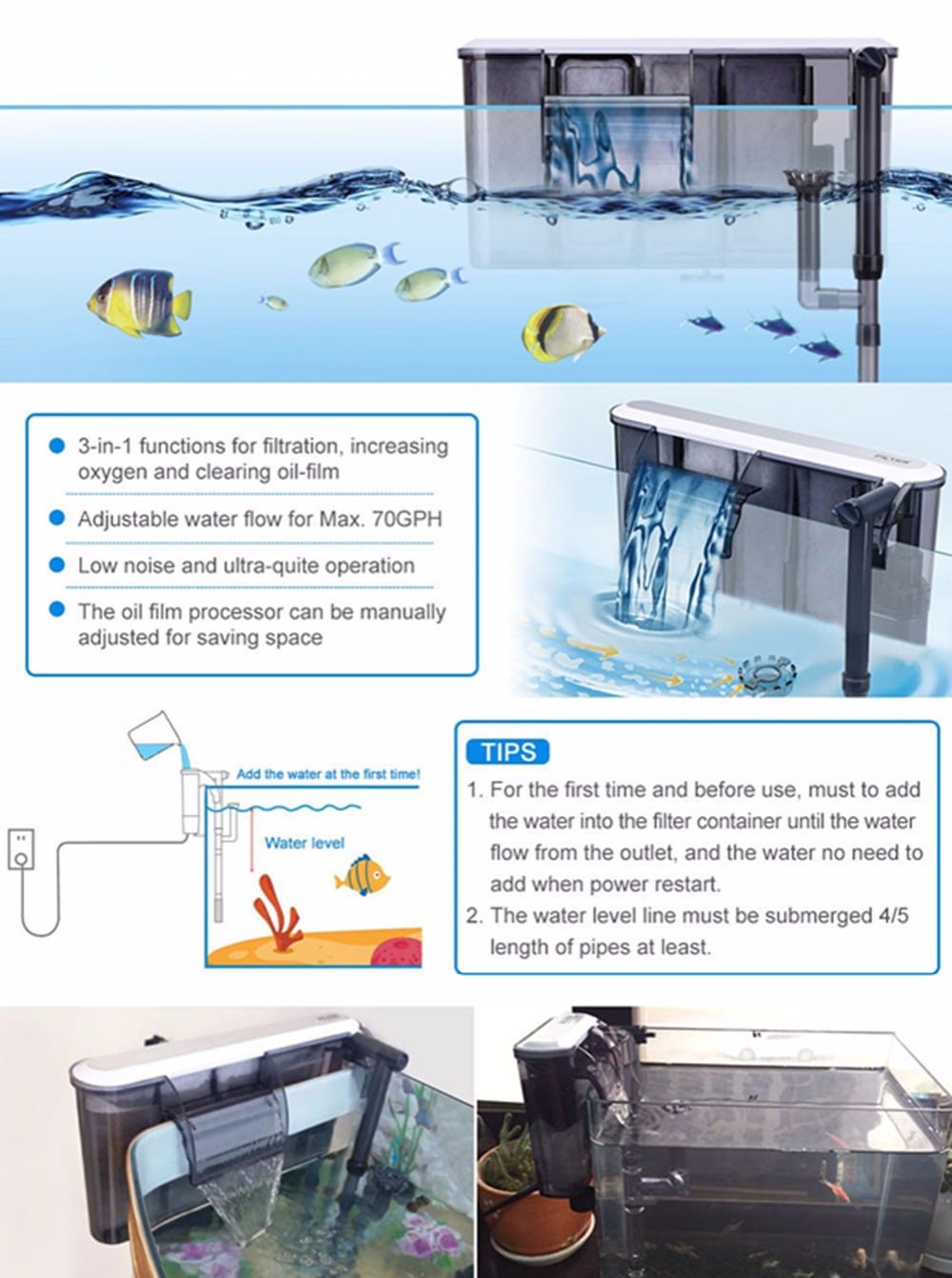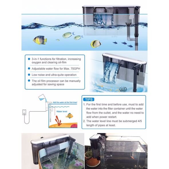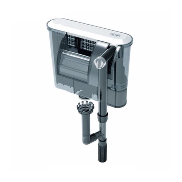 Αθόρυβο εξωτερικό φίλτρο ενυδρείου 2 σε 1 που κρεμιέται στα τοιχώματα. Διαθέτει σωλήνα αναρρόφησης με δύο τρύπες εισόδου νερού. Μια στον βυθό του ενυδρείου για γενικό καθαρισμό του νερού και μια στην επιφάνεια του νερού για καθαρισμό από σκόνη και μικρό - βρομιές που επιπλέουν και απαλλαγή από το πρωτεϊνικό φιλμ (protein film) ή στρώση λαδιού (oil film processor) που δημιουργούνται συνήθως από την τροφή.