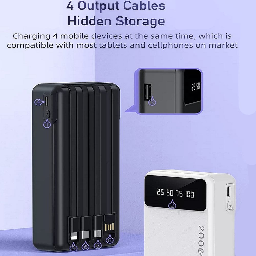 Διαθέτει 4 ενσωματωμένα καλώδια φόρτισης - εξόδους Lightning, Type-C, MicroUSB και USB, έτσι ώστε να μπορεί να φορτίσει το μεγαλύτερο δυνατό εύρος συσκευών και χωρίς να απαιτεί να θυμηθείτε να φέρετε καλώδιο μαζί σας!