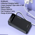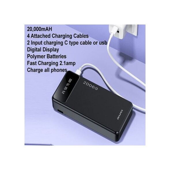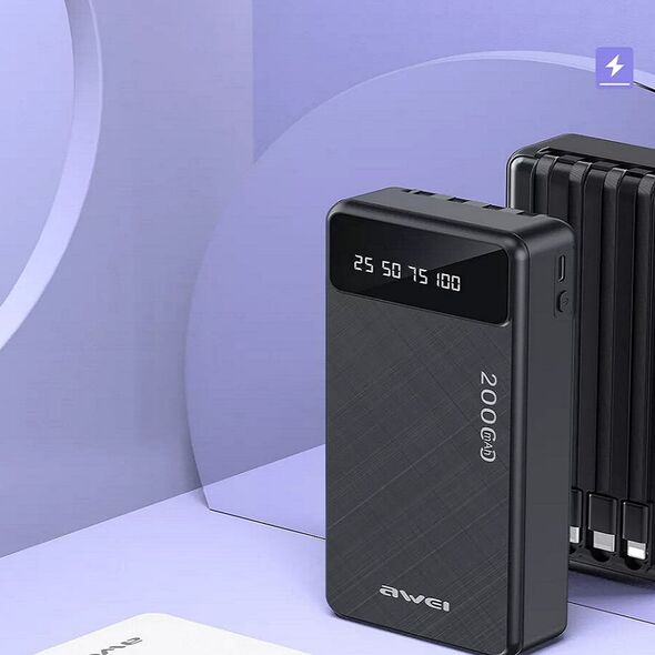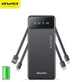 Awei 4 σε 1 Power Bank - Φορητή Μπαταρία Φορτιστής 20000mAh με 4 Ενσωματωμένα Καλώδια Εξόδους Lightning, Type-C, MicroUSB, USB & LED Ένδειξη Μπαταρίας
