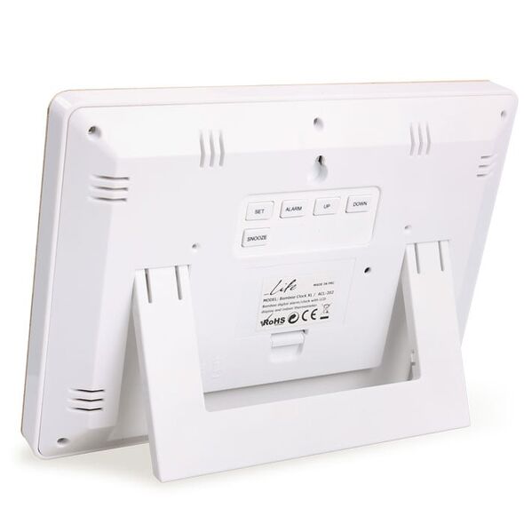 Ψηφιακό ρολόι / ξυπνητήρι με XL οθόνη LCD 7.5" και πρόσοψη από bamboo! Διαθέτει επιπλέον ένδειξη ημερομηνίας και ημέρας της εβδομάδας, θερμοκρασίας εσωτερικού χώρου, λειτουργία αφύπνισης και snooze, όπως επίσης και ένδειξη σεληνιακής φάσης.