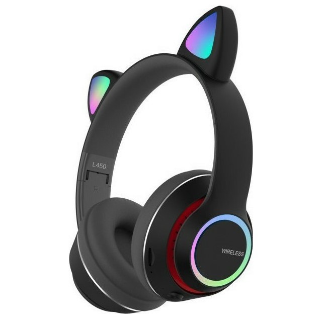 Bluetooth Ασύρματα & Ενσύρματα Ακουστικά Αυτιά Γάτας Αναδιπλούμενα με Πολύχρωμα Φώτα LED RGB - Μαύρο