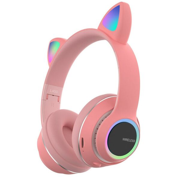 Bluetooth Ασύρματα & Ενσύρματα Ακουστικά Αυτιά Γάτας Αναδιπλούμενα με Πολύχρωμα Φώτα LED RGB - Ρόζ
