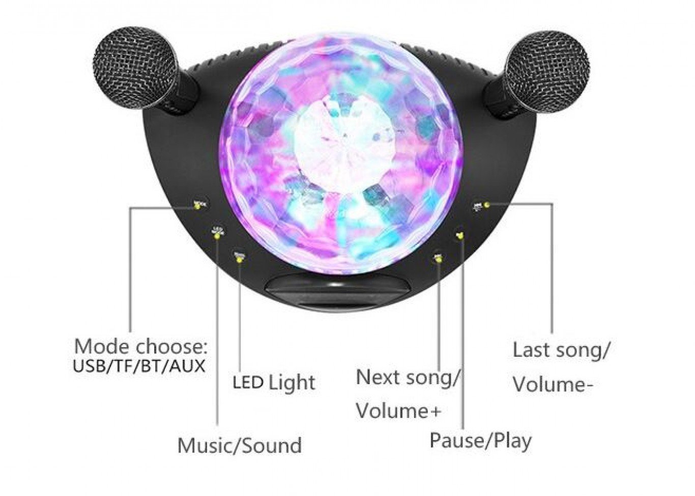Λειτουργεί ως σύστημα ΚΑΡΑΟΚΕ κάνοντας μίξη κάθε πηγής ήχου ( SD card, USB, line in, bluetooth ) με τα 2 δυναμικά μικρόφωνα που περιλαμβάνει και αναπαράγει δυνατά και καθαρά μουσική και φωνητικά, ενώ