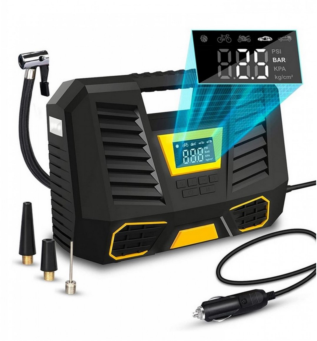 Συνοδεύεται από 3 επιπλέον εξαρτήματα έτσι ώστε να μπορείτε να φουσκώσετε λάστιχα αυτοκίνητου, ποδηλάτου και μηχανής, μπάλες, στρώματα θαλάσσης κ.α