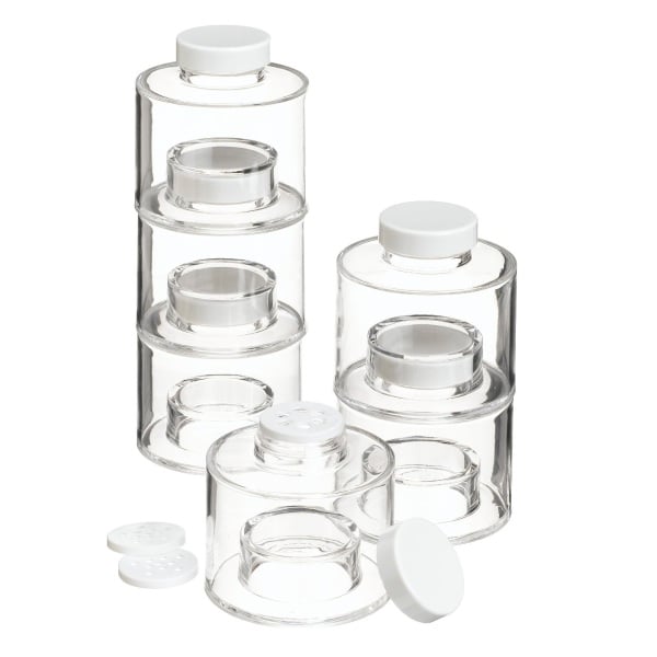 Βαζάκια μπαχαρικών, τα οποία τοποθετούνται το ένα πάνω στο άλλο με ασφάλεια, και είναι διάφανα για να βλέπετε το περιεχόμενο.
