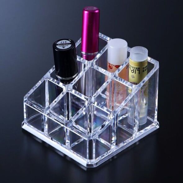 Είναι κατασκευασμένος από διάφανο ακρυλικό plexiglass πολύ ανθεκτικό. Το σχέδιο της είναι σε σχήμα τετράγωνο με 9 θήκες, ιδανικό για την τοποθέτηση κραγιόν.