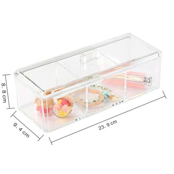 Είναι κατασκευασμένος από διάφανο ακρυλικό plexiglass πολύ ανθεκτικό. Το σχέδιο της είναι σε σχήμα ορθογώνιο με 3 θήκες, ιδανικό για την τοποθέτηση προιόντων καλοπισμού. Επιπλέον περιλαμβάνεται και καπάκι για τη θήκη για προστασία.