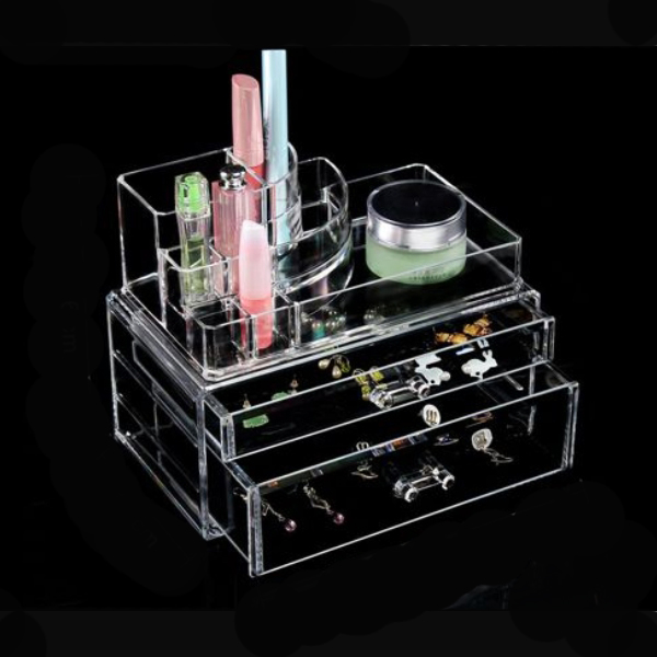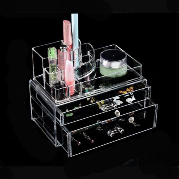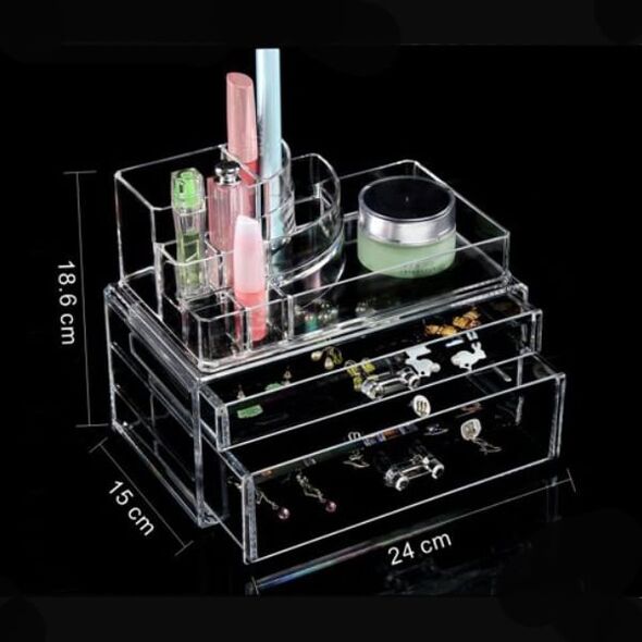 Είναι κατασκευασμένος από διάφανο ακρυλικό plexiglass πολύ ανθεκτικό. Το σχέδιο της είναι σε σχήμα ορθογώνιο με δυο επίπεδα, όπου το ένα περιλαμβάνει ένα μεγάλο συρτάρι, ενώ το άλλο ένα μικρότερο, ιδανικά για την τοποθέτηση προιόντων καλοπισμού και ιδιαίτερα κοσμημάτων, ενώ στην κορυφή βρίσκονται μικρές θήκες και ένας μεγαλύτερος ελεύθερος χώρος στα δεξιά, για να τοποθετήσετε οτιδήποτε θέλετε!