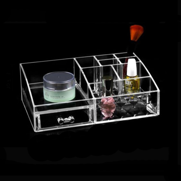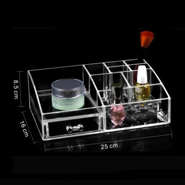 Είναι κατασκευασμένος από διάφανο ακρυλικό plexiglass πολύ ανθεκτικό. Το σχέδιο της είναι σε σχήμα ορθογώνιο, με τετράγωνες και ορθογώνιες θήκες σε διάφορα μεγέθη και στο αριστερό σημείο υπάρχει συρτάρι , για να τοποθετήσετε οτιδήποτε θέλετε!
