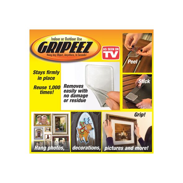 Το Gripeez είναι διπλής όψεως πανίσχυρο αυτοκόλλητο, το οποίο παραμένει στην θέση του μέχρι να το μετακινήσετε. Επίσης, μπορείτε να το αφαιρέσετε και να επανατοποθετήσετε όποτε θέλετε, χωρίς να αφήνει υπολείμματα. Μπορεί να χρησιμοποιηθεί και σε εξωτερικούς χώρους.