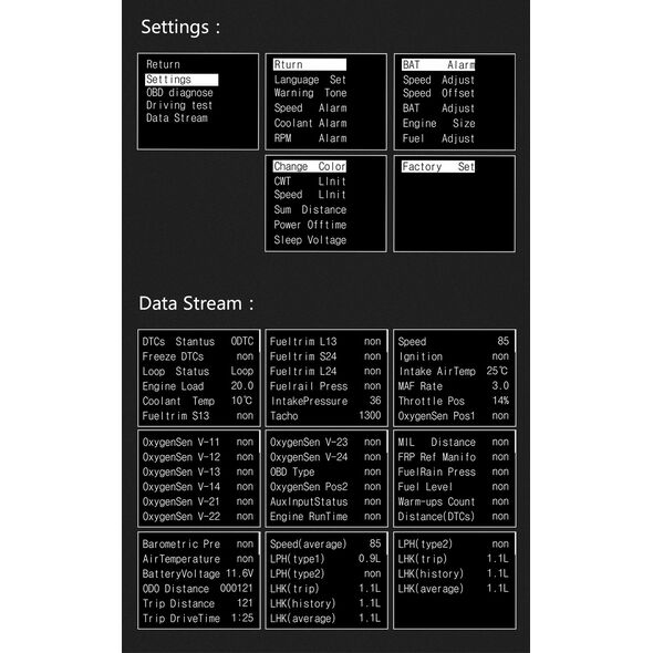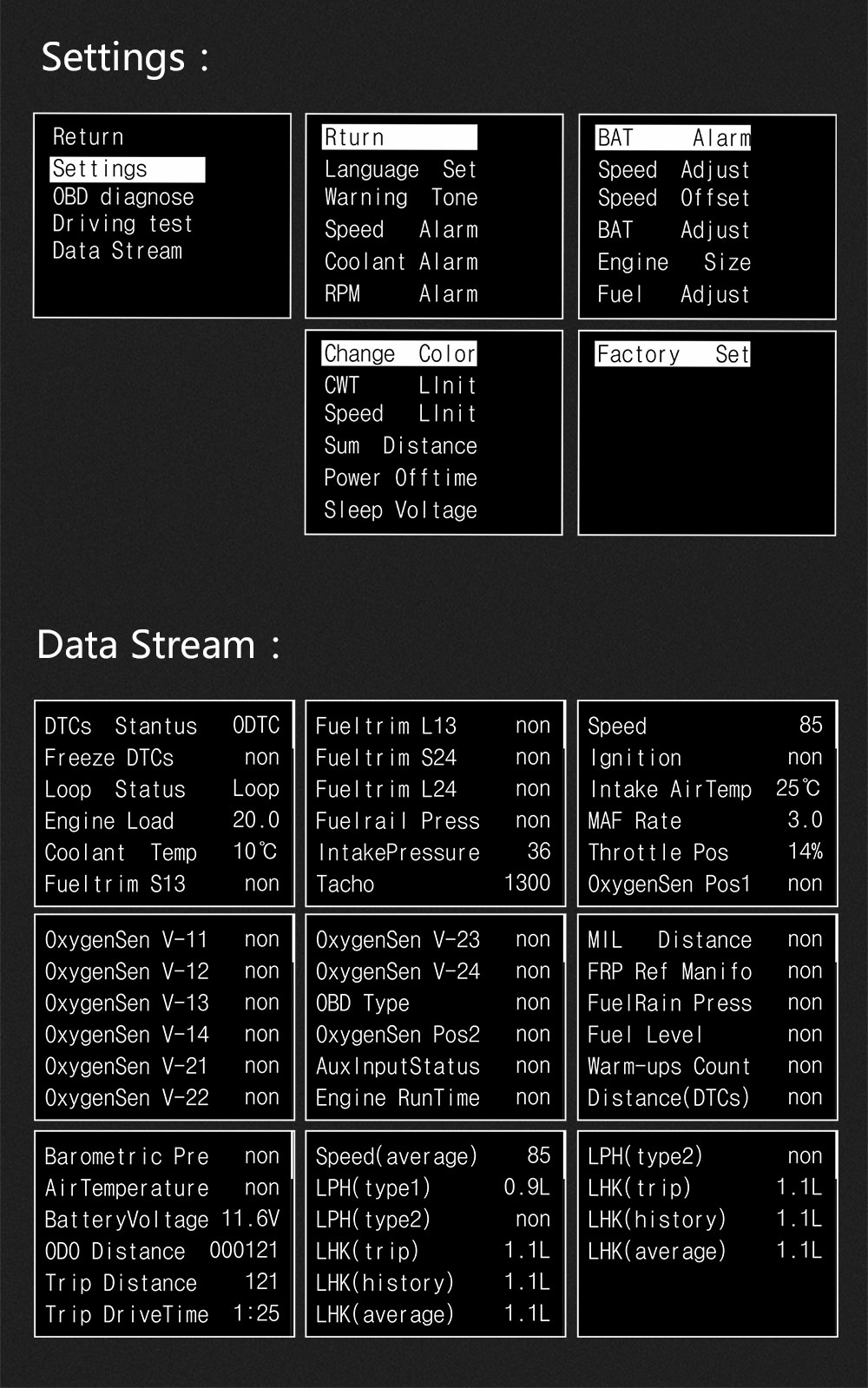Εμφάνιση δεδομένων οδήγησης σε πραγματικό χρόνο όπως ταχύτητα οχήματος, στροφές κινητήρα, κατανάλωση καυσίμων, θερμοκρασία νερού, τάση, βολτόμετρο κ.α.