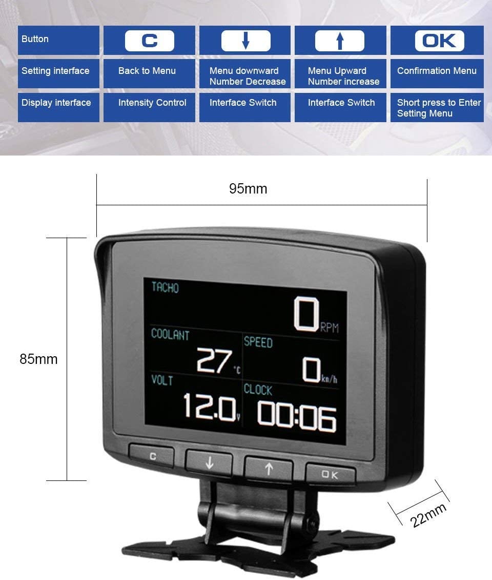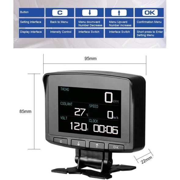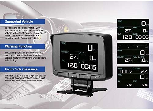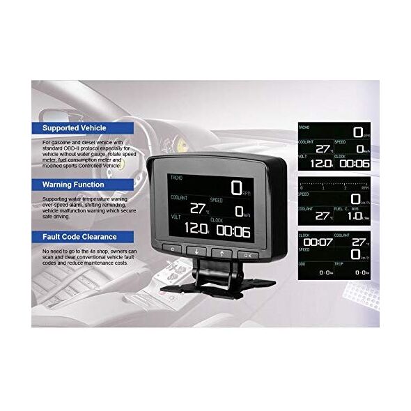 Ειδικό για οχήματα χωρίς μετρητή θερμοκρασίας, ταχύμετρο, στροφόμετρο και κατανάλωση καυσίμων. Είναι ένα OBD πολλαπλών λειτουργιών ένα κομψό και συμπαγές σχήμα για να ταιριάζει σε κάθε όχημα.
