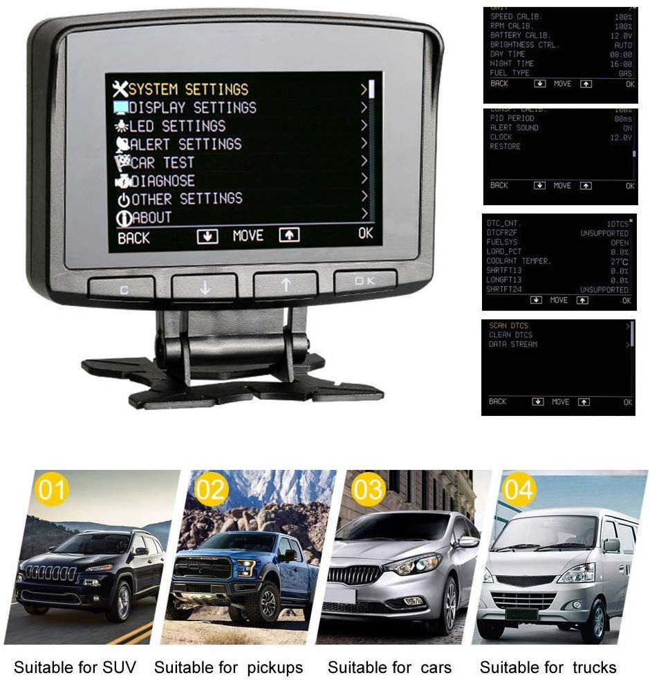 Ειδικό για οχήματα χωρίς μετρητή θερμοκρασίας, ταχύμετρο, στροφόμετρο και κατανάλωση καυσίμων. Είναι ένα OBD πολλαπλών λειτουργιών ένα κομψό και συμπαγές σχήμα για να ταιριάζει σε κάθε όχημα.