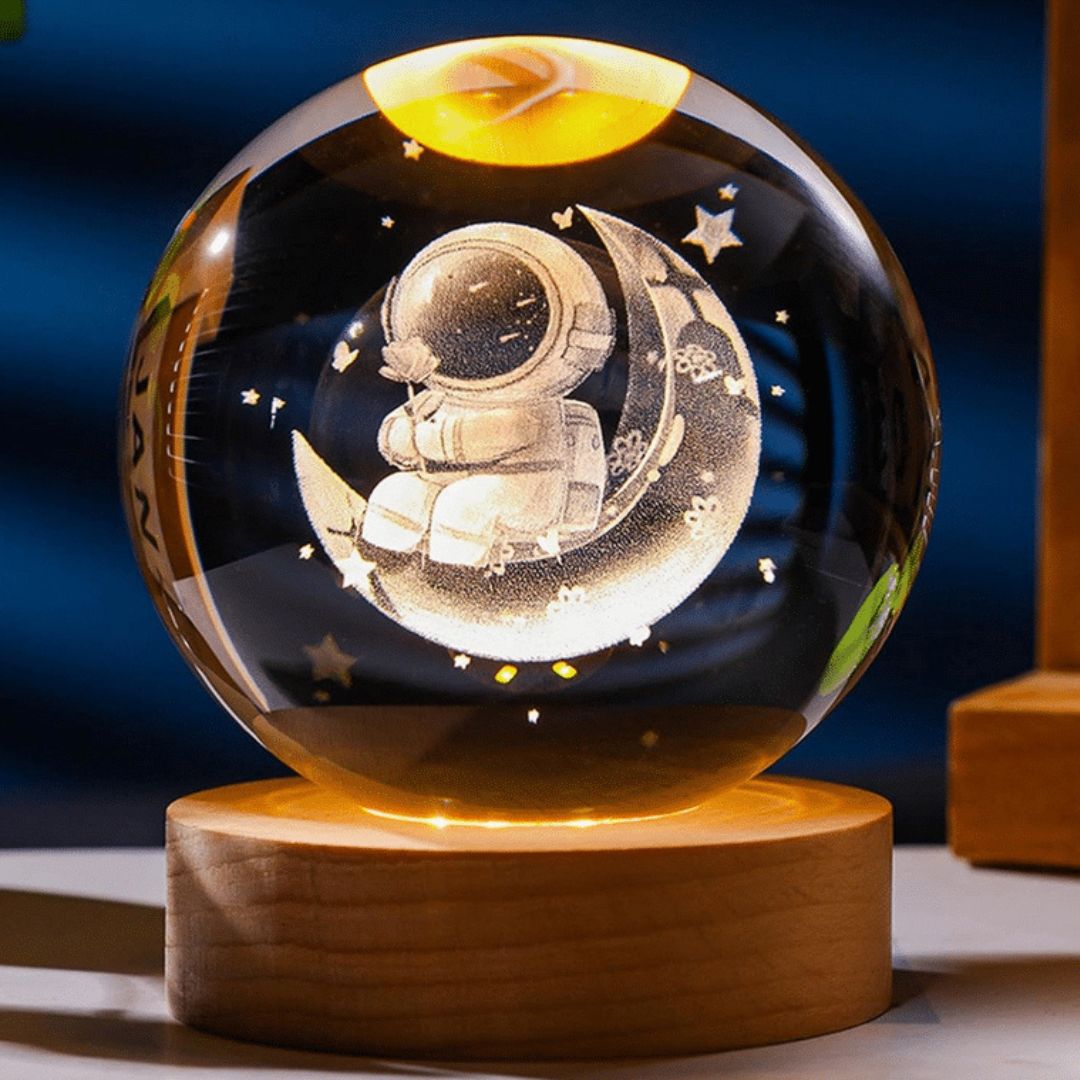 Η κρυστάλλινη σφαίρα με τον αστροναύτη καθισμένο σε μισοφέγγαρο δεν είναι απλώς ένα φωτιστικό – είναι ένα κομψό διακοσμητικό στοιχείο που δημιουργεί ατμόσφαιρα και προσθέτει φαντασία στον χώρο.