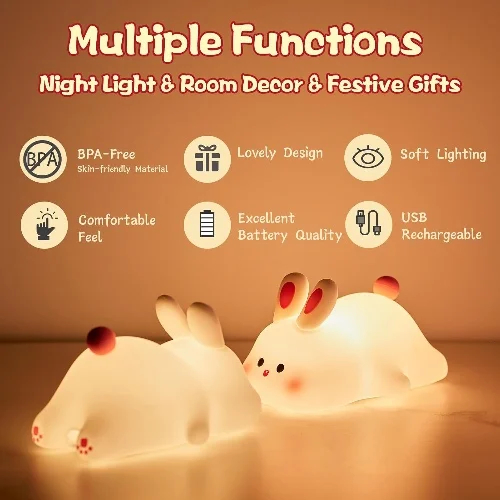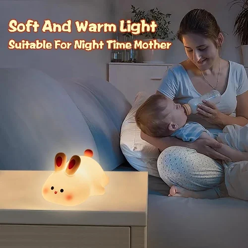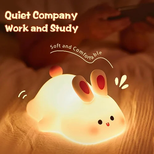 Φωτιστικό USB σιλικόνης κουνελάκι με 3 λειτουργίες LED, απαλή σιλικόνη και επαναφορτιζόμενη μπαταρία 1200mA. Ιδανικό για παιδικό δωμάτιο, γραφείο ή δώρο – χαρίζει γλυκό, απαλό φως και ζεστή ατμόσφαιρα.