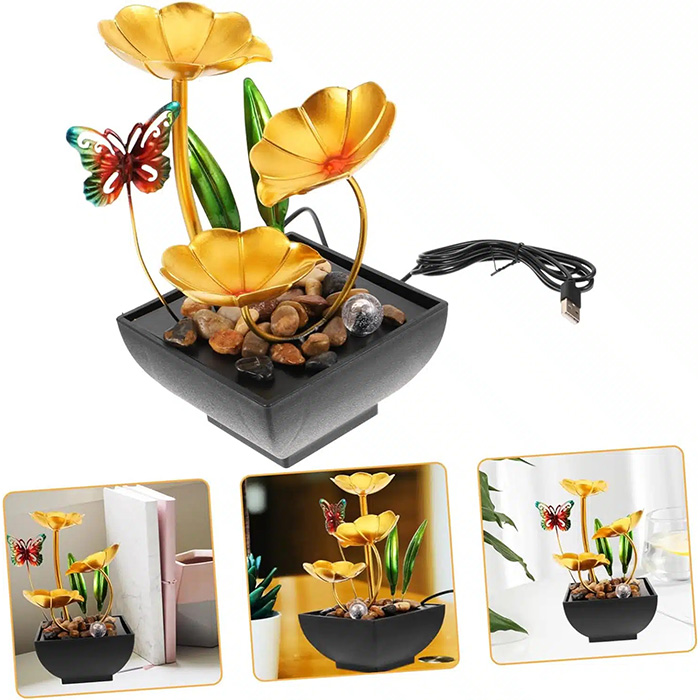 Συντριβάνι LED εσωτερικού χώρου με καθοδική ροή νερού τριών επιπέδων και κομψό, minimal σχεδιασμό με χρυσά φύλλα και φυτά που θα προσφέρει ηρεμία και χαλάρωση γεμίζοντας το χώρο σας με θετική ενέργεια.