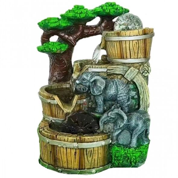 Διακοσμητικό Συντριβάνι Feng Shui με 2 Ελέφαντες, 3 Βαρέλια, Τρεχούμενο Νερό & Πολύχρωμο Φωτισμό LED 20x17x27 εκ